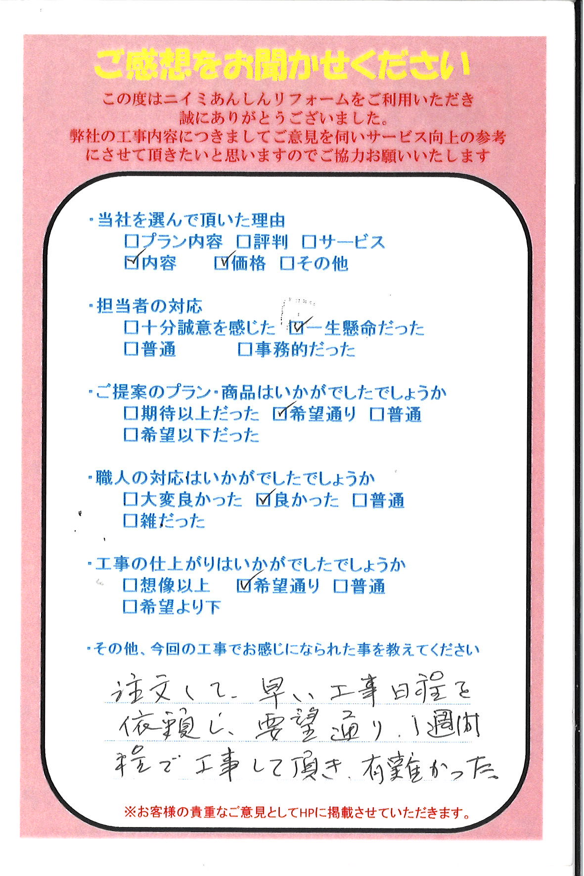 注文して早い工事日程を依頼し、要望通り1週間ほどで